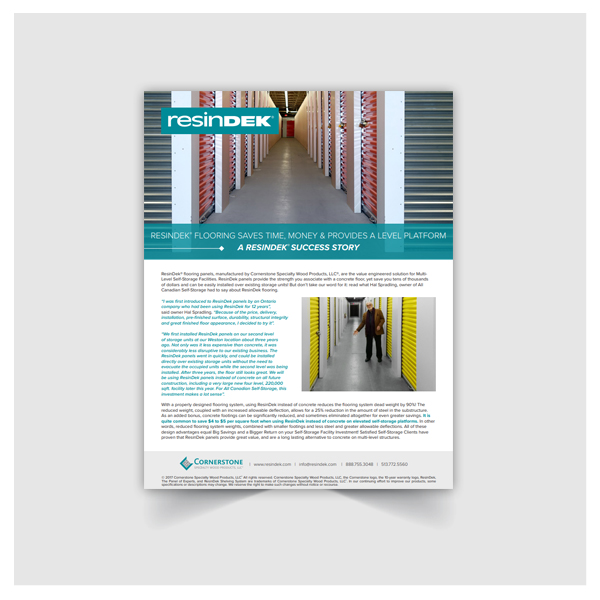 ResinDek® LD flooring panels, manufactured by Cornerstone Specialty Wood Products, LLC®, are the value engineered solution for Multi-Level Self-Storage Facilities. ResinDek panels provide the strength you associate with a concrete floor, yet save you tens of thousands of dollars and can be easily installed over existing storage units! But don’t take our word for it: read what Hal Spradling, owner of All Canadian Self-Storage had to say about ResinDek flooring.