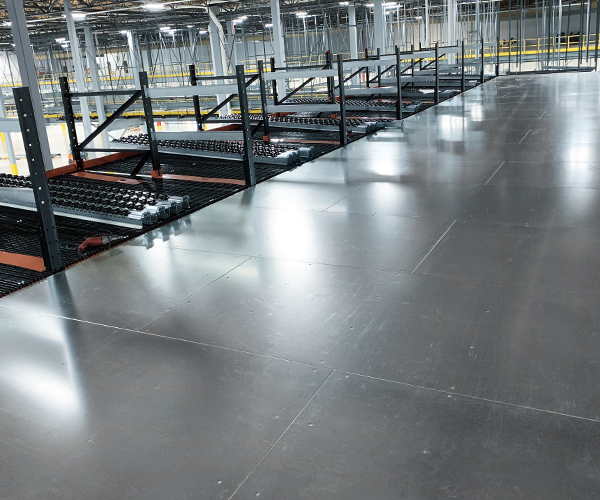 Our most durable finish, MetaGard GVT, features galvanized steel that encapsulates the top and sides of a ResinDek panel. Ideal for drop zones, pallet flow and case flow modules, MetaGard GVT heavy-duty metal flooring delivers ironclad resistance in abusive, harsh environments. This includes extremely high traffic areas where heavy equipment and rolling pallet jacks routinely transport dense loads. It is also an optimal flooring solution for locations where aggressive dragging or pulling of non-wheeled loads occurs.